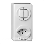 Weiss, Kombination 2 Apparate senkrecht (2x1), Doppel-Druckschalter Aus/Wechsel 3/1 L / Einfach-Steckdose Typ 13, L + N + PE, mit Steckklemmen, Anbauhöhe 48 mm, X, IP 20, 120 x 60 mm