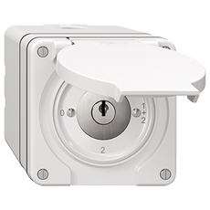 Drehschalter • Mit Sicherheitsschloss und 2 Schlüsseln • 16 A, 240/400 V AC • Mit Schraubklemmen • Serieschalter • 1/1 L • KS 0 - 1 - 1+2 - 2 • Anbauhöhe 93 mm • NAP.Q • weiss • IP55