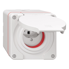 Einfach-Steckdose Typ 23 • IP55/IP55 • Mit roter Dichtung • 16A, 250 V AC, L + N + PE • Mit Steckklemmen • Anbauhöhe 81 mm • NAP.Q • weiss • IP55 • 87 x 87 mm • Deckel geschlossen IP55