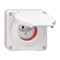 Einfach-Steckdose Typ 23 • IP55/IP55 • Mit roter Dichtung • 16A, 250 V AC, L + N + PE • Mit Steckklemmen • Anbauhöhe 81 mm • NAP.Q • weiss • IP55 • 87 x 87 mm • Deckel geschlossen IP55